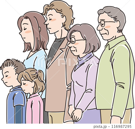 色々な年代の人物_横向き_目を閉じてうつむく_3世代6人家族_小学生_両親_祖父母