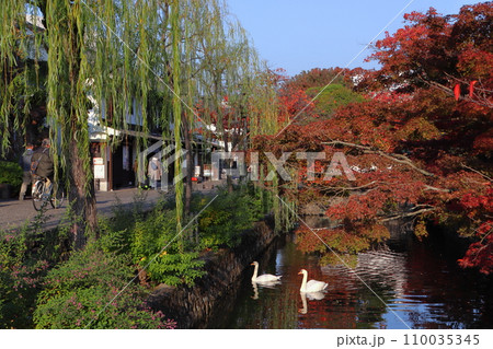 紅葉彩る晩秋の倉敷美観地区:倉敷川畔のコブハクチョウ