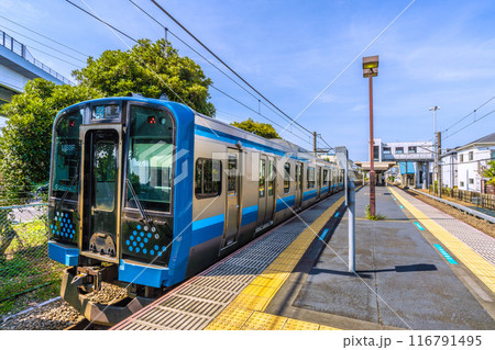 日本の寒川都市景観 JR相模線 倉見駅や電車(先頭車両橋本行き)などを望む=令和6年7月