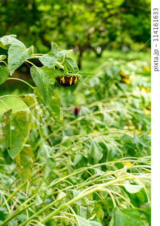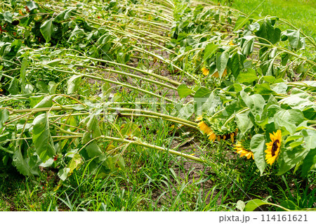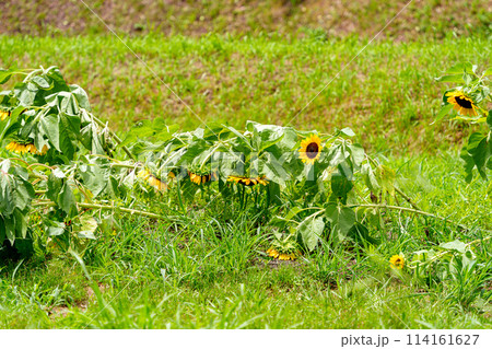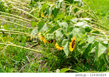 強風で倒れてしまったひまわりの花