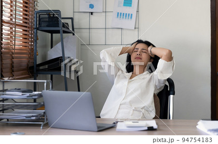 Asian businesswoman overworked at office stressful anxiety with serious problems. Woman exhaustion depress and mental burnout feeling tired frustrate at company office. Stress sadness contemplation