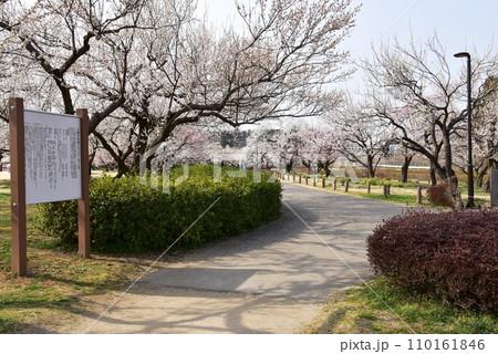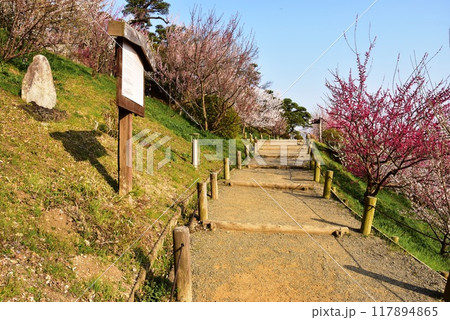 水戸市 偕楽園周遊路と満開梅の花と道しるべ