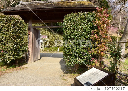 水戸市 偕楽園の好文亭表門と満開白梅と道しるべ