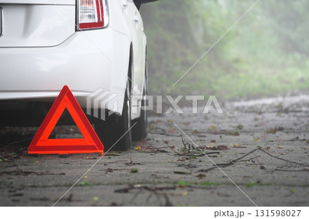 山道に駐車した車と事故防止の安全の為に置かれた三角停止板
