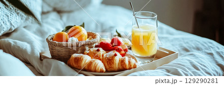 Fresh fruits and buttery croissants served on a tray beside a sparkling mimosa create a cozy breakfast setting in a tranquil hotel room. Perfect for a leisurely morning retreat, banner