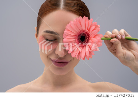 Woman holding gerbera flower and using lifting patches enjoying spa treatment