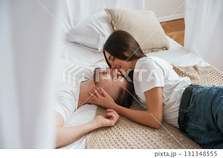 On the bed, lying down and smiling. Young couple are together at home