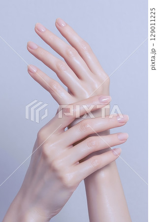 Flawless Moisturized Hands with a Glossy Nude Manicure in an Elegant Pose.