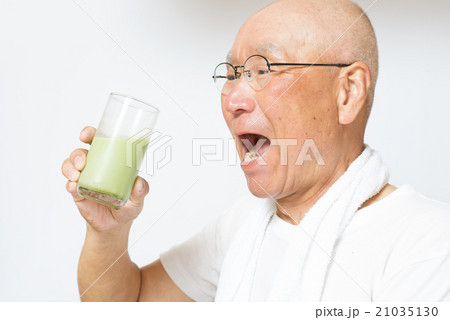 健康ドリンクを笑顔で飲むシニア