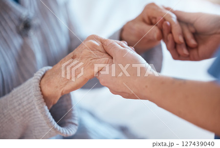 Elderly woman hands, support and holding healthcare worker for medical care or help walking. Retirement care, senior person and holding hands for volunteer caregiver service in health community