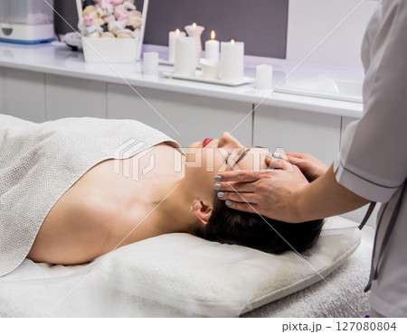 Beautiful young woman enjoying head massage in spa salon. Cosmetology