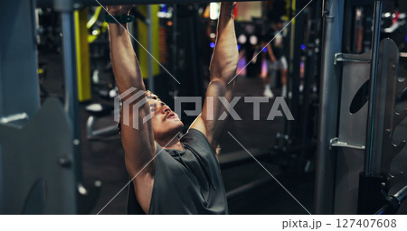 ジム・トレーニングジムでパワーラックのケーブルを使って胸の筋トレをする若いアジア人男性