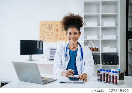 Beautiful physician doctor sit on table in office hospital. Attractive therapist female practitioner pharmacist smile and use tablet and laptop in hospital.after success work from treatment