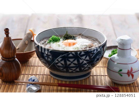 湯気立つとろろそば 卵黄とねぎの和風そば料理