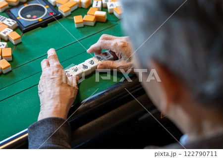 電動麻雀卓で麻雀をしているシニアの手元