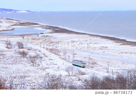 雪に覆われた釧路市音別地区の海岸線を行く普通列車