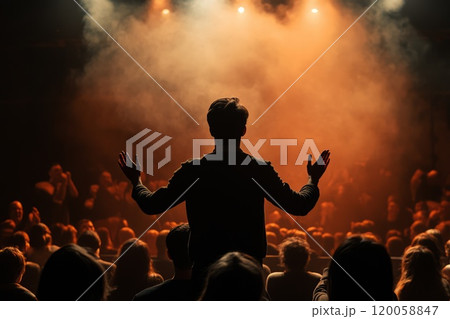 silhouette of a man from the back coming out from behind the scenes onto the stage