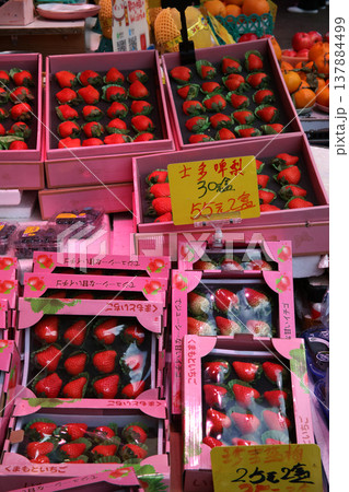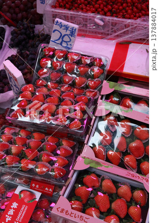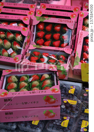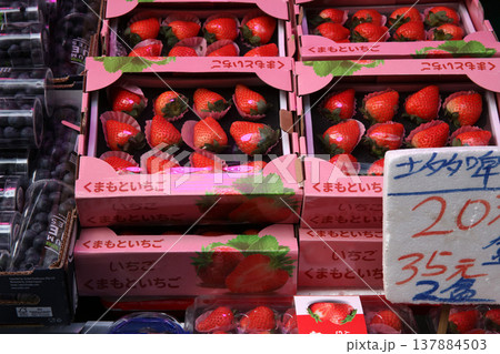 モンコック青空市場で売られる「くまもといちご」とひらがなで書かれたイチゴ。実際は中国産