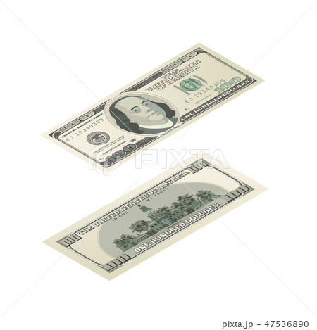 Couple of fake one hundred USA dollars banknote, front and back detailed coupure in isometric view