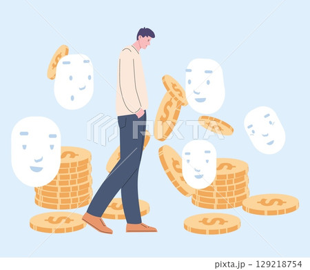 Artificial world of rich man. Fake friends and emotions, difficult social communication. Deception in relationship. Sad guy, money piles and masks, vector concept