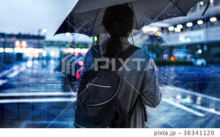 Young asian woman with umbrella feeling cold in the rain, waiting for taxi