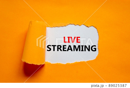 Live streaming symbol. Concept words Live streaming appearing behind torn orange paper. Beautiful orange background. Business, live streaming concept, copy space.