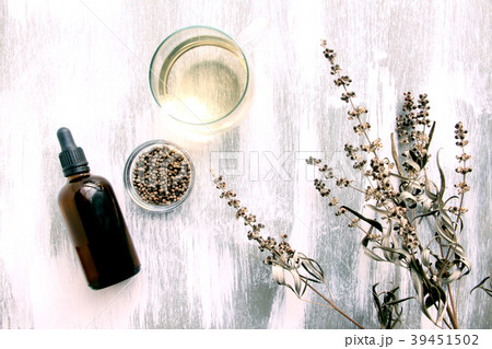 ガラス瓶に入ったチェストツリー、ドライハーブ