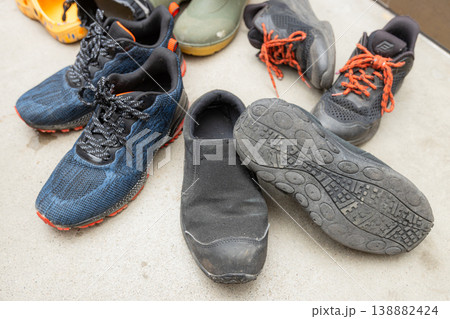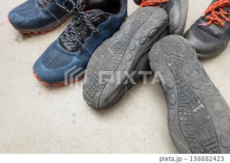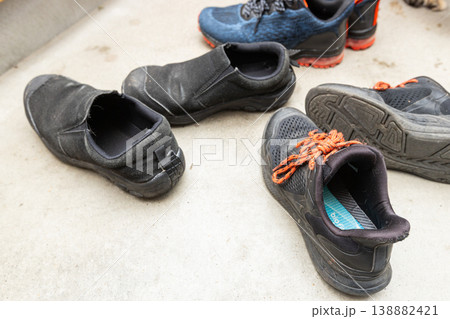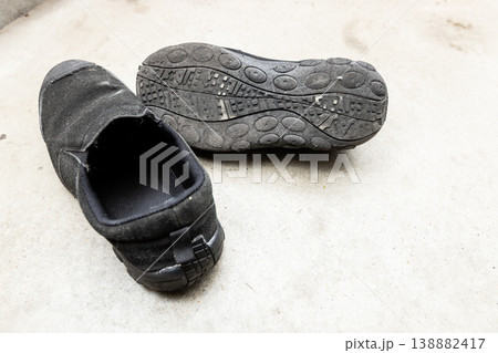 使い古した黒い靴 靴底がすり減っている安全配慮がない