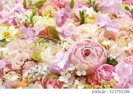 Delicate blooming roses and pink summer flowers, blossoming rose flower soft pastel background, bouquet floral card, festive flowerwall for wedding