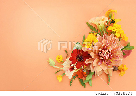 Delicate blossoming dahlias and orange flowers posy, blooming festive fall bouquet, autumn floral background card, selective focus, toned