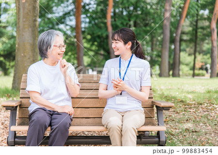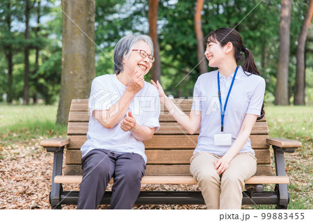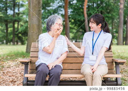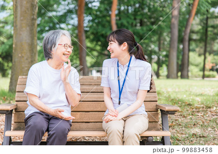 公園で話す笑顔の介護スタッフの女性と高齢者(話す・楽しい)