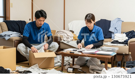 散らかった部屋を片付けている男女二人の作業員 遺品整理業者