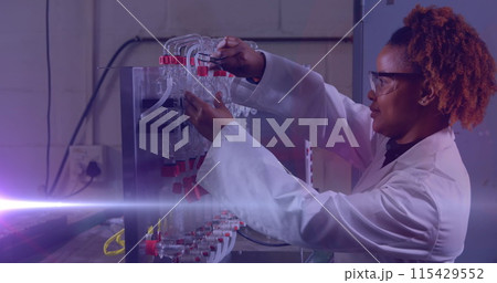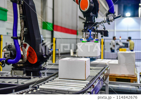 Automation robot arms holding a white box and worker operating a robot machine with a control panel