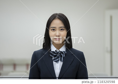 カメラ目線で笑顔の女子高校生 ポートレート 撮影協力:有明教育芸術短期大学