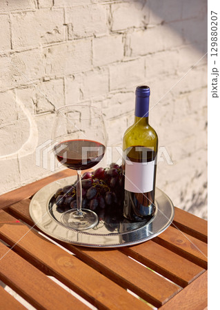 Red wine bottle with blank label with grapes and glass on tray outdoor setting