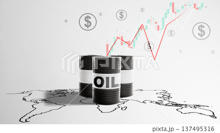 Conceptual image of oil barrels on a world map with a fluctuating stock market graph and dollar signs, illustrating global energy trade, price volatility, and economic impact