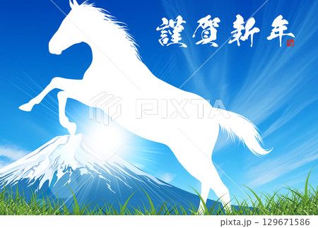 馬と草原の白い雲と青い空の年賀状テンプレート