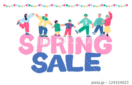 春を楽しむ人々とスプリングセールの文字のポップでカラフルな手書きのイラスト