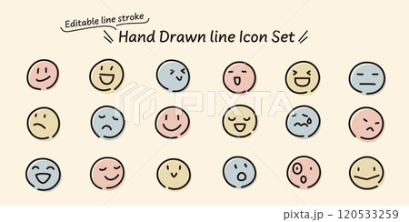 線の編集が可能なベクターイラスト。手描きのいろいろな表情の顔のビンテージ風アイコンセット