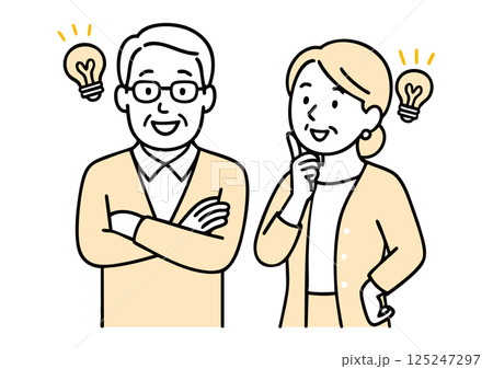 アイデアをひらめいたシニア夫婦のイラスト(電球・発想・暮らしの知恵)
