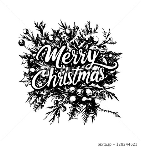 Festive "Merry Christmas" Typography with Holly and Berries on White Background.