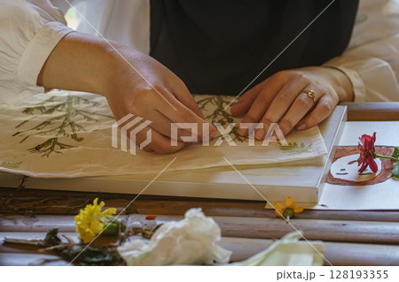 Serene woman with long hair against a botanical backdrop in warm tones, AI Generative