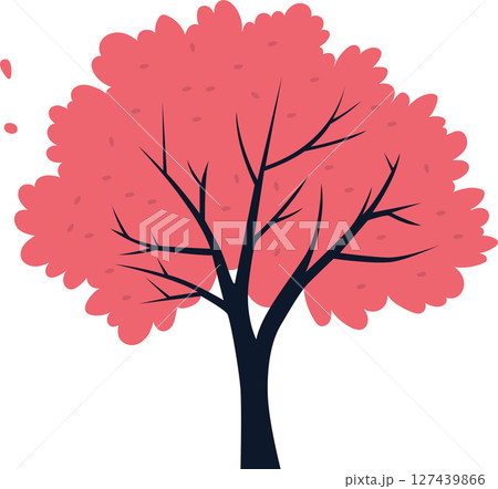 A stylized pink flowering tree with dark branches set against black backdrop.