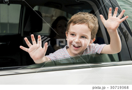 Boy Child in Car Cheerful Smiling Greeting