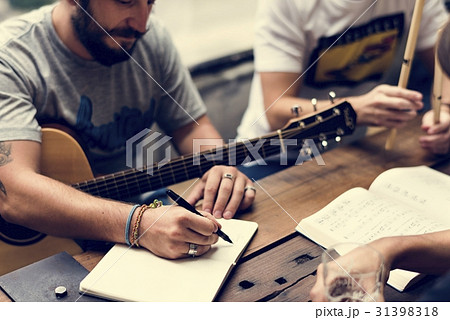 Men Play Guitar Write Song Music Reheaesal