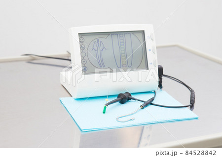 electronic device for the treatment of dental canals in the hands of a dentist in a treatment room. Photo without face.