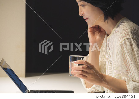 夜、パソコンに向かって作業するミドル女性