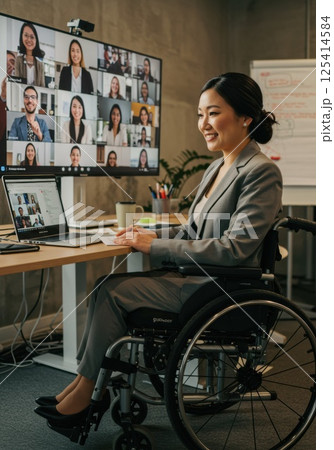 車椅子でビデオ会議をリードする日本人女性(ai生成画像)