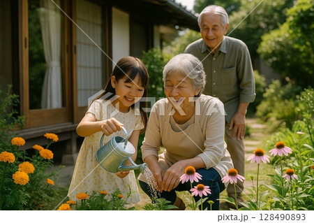 庭先で祖母と花の水やりを楽しむ小学生の女の子