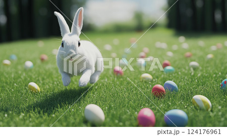 芝生の上で跳ねる白ウサギと色とりどりのイースターエッグ